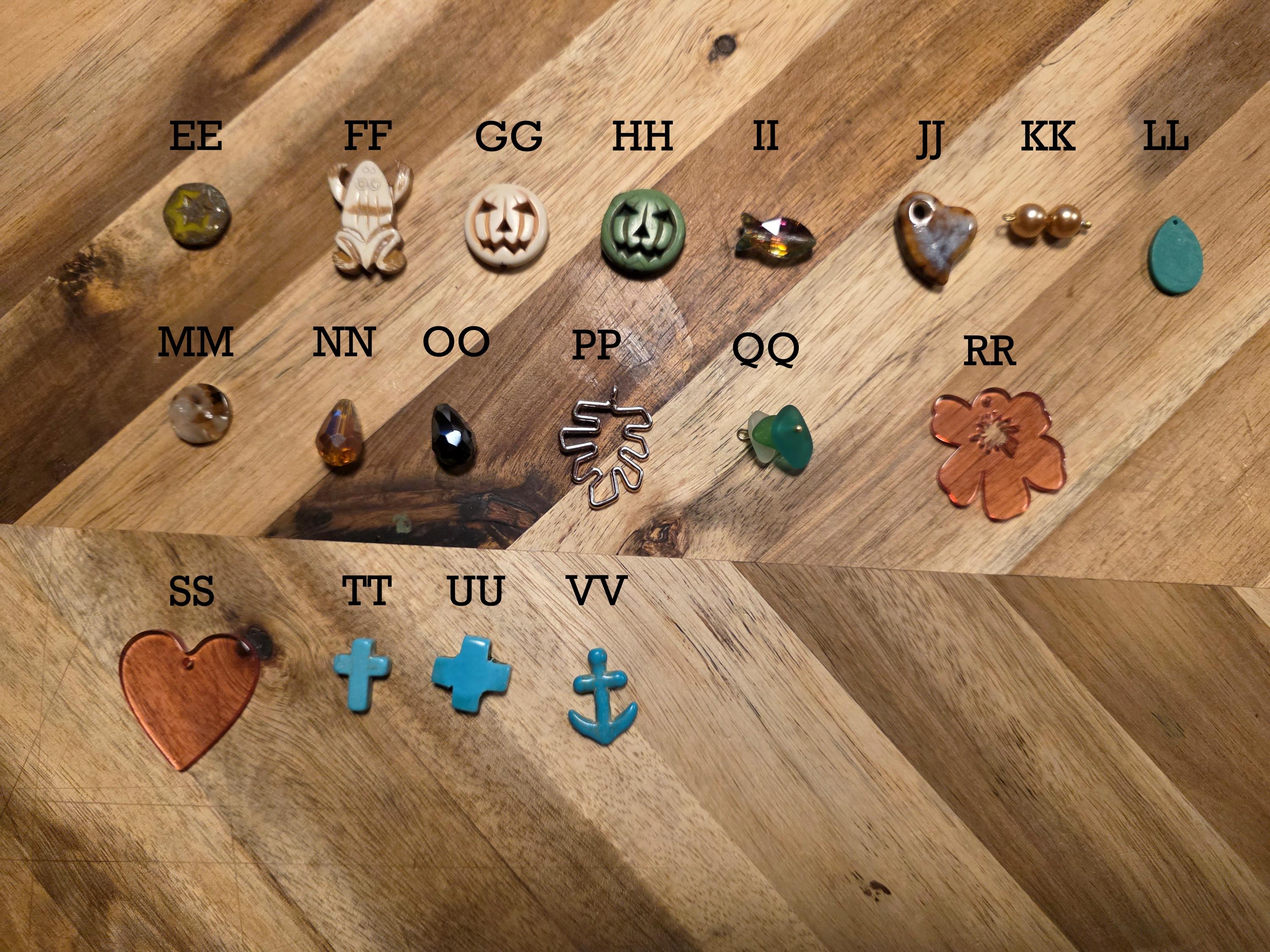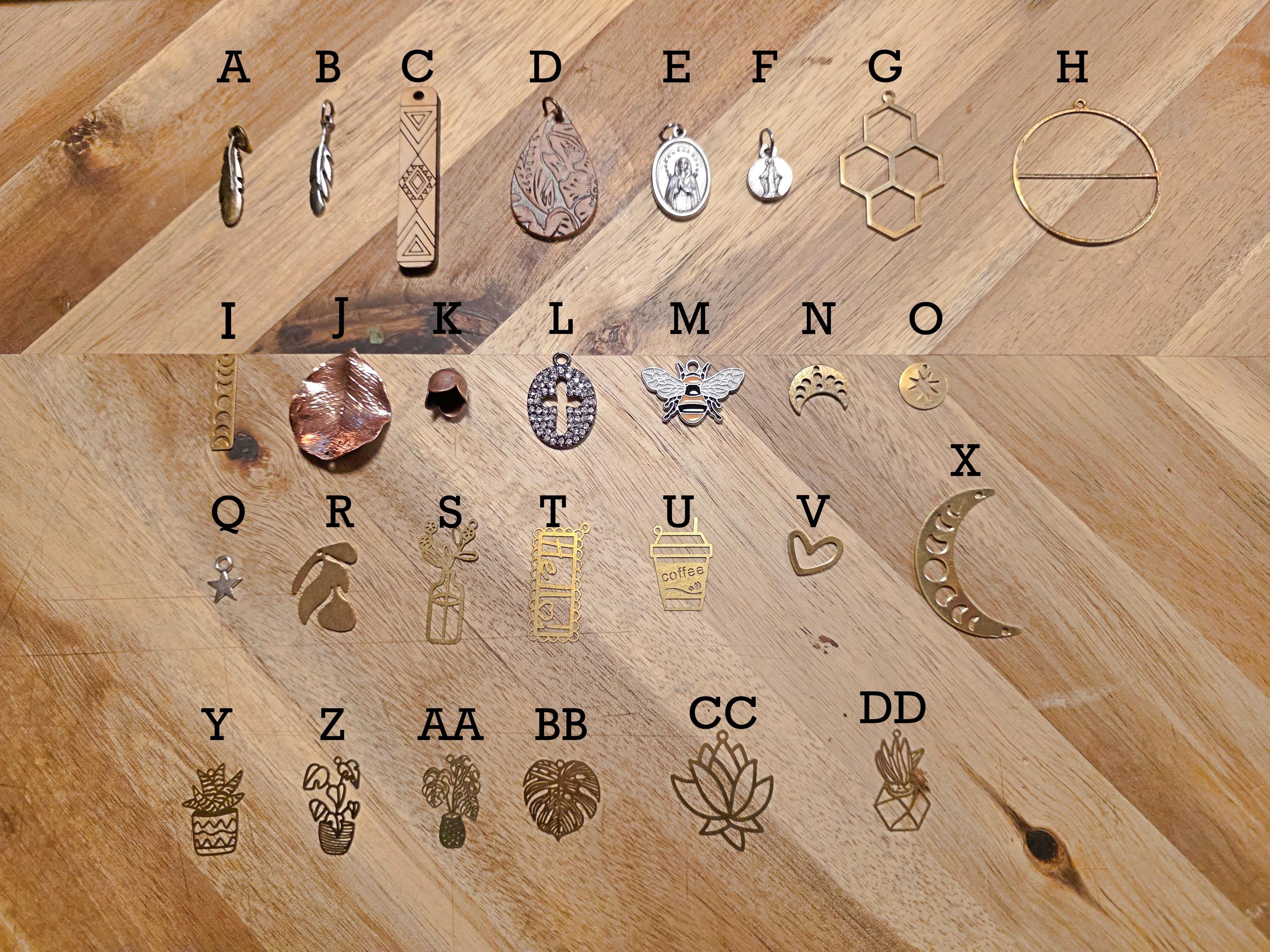 Dress up your journals, bracelets, necklaces or and DIY project that calls for some personality. Charms are, silver, gold, brass and some rose gold. What pictured is what we have in that color.