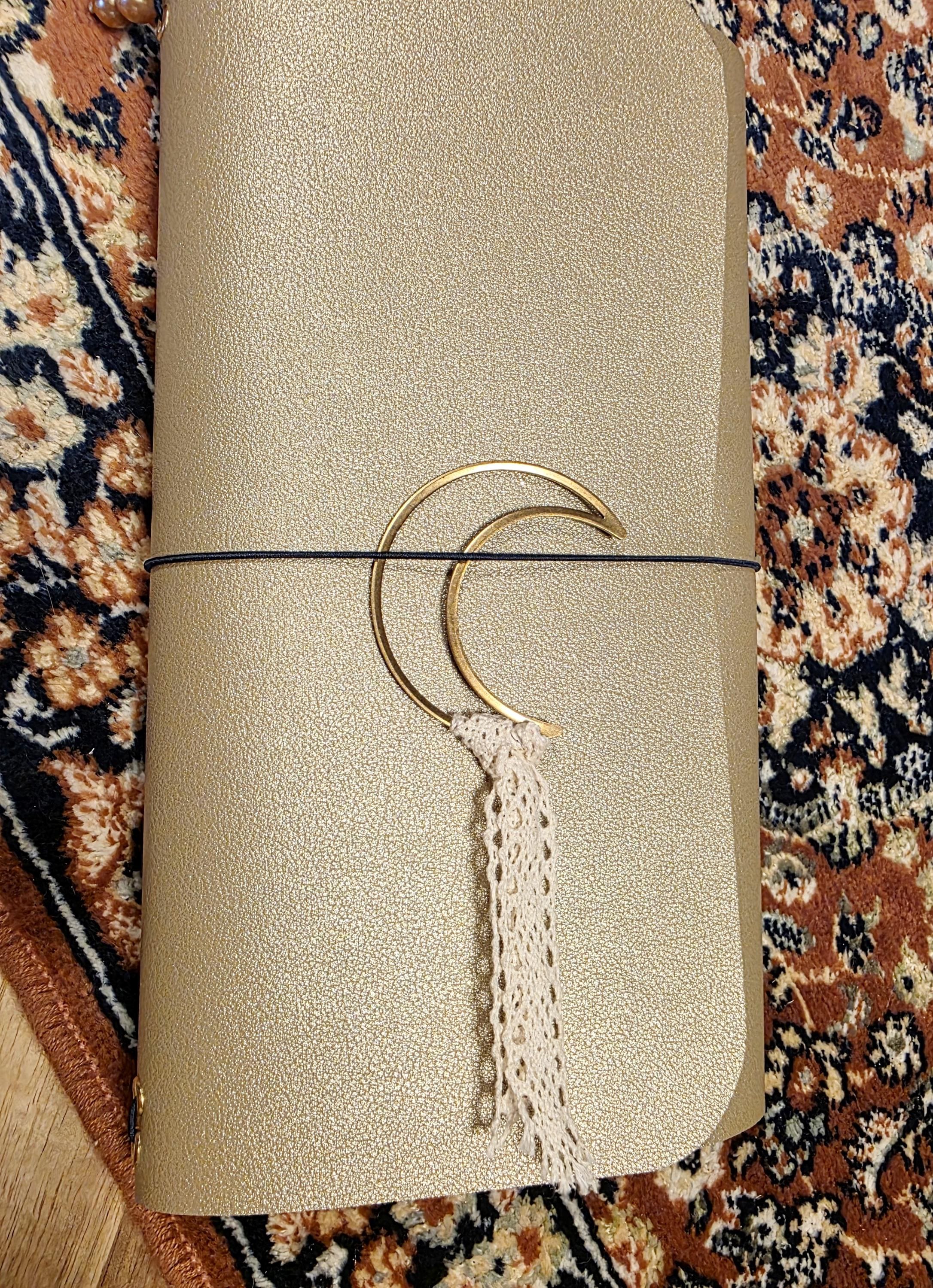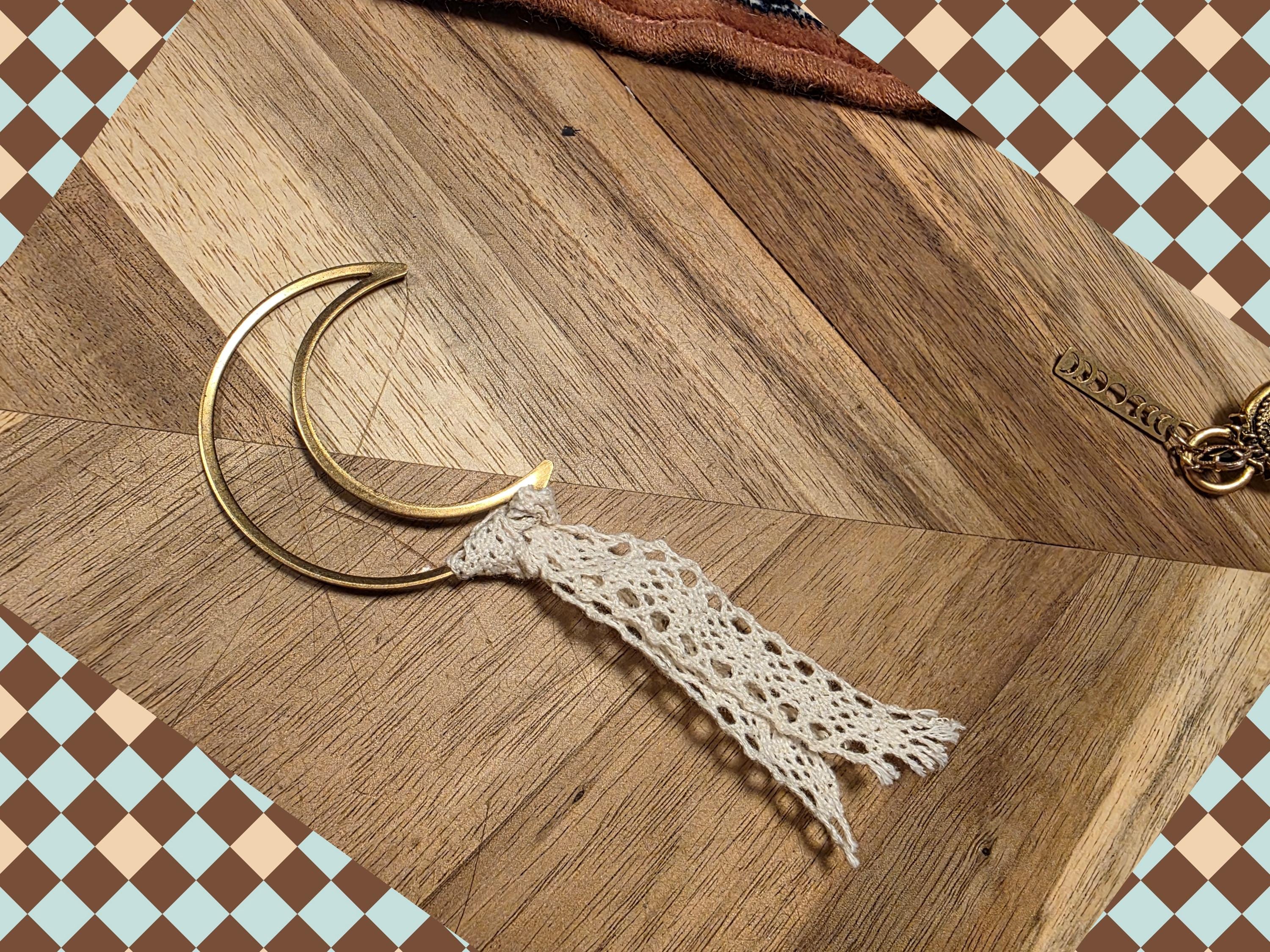 Embellish your journal or any book with this brass crescent moon and lace book mark. Roughly 4 inches in length.