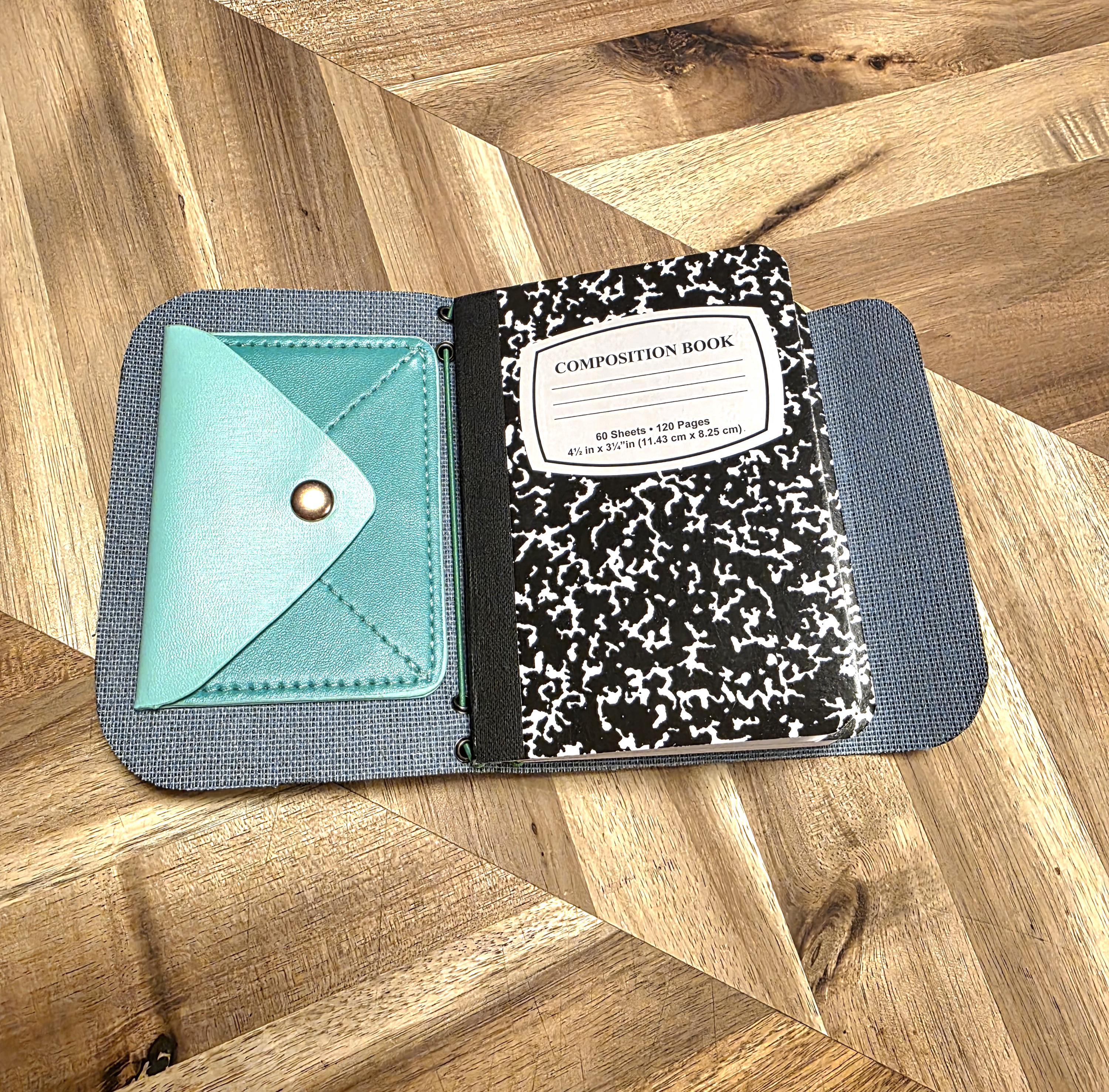 Each Journal will include 2 lined composition notebooks and a kraft cardstock portfolio wallet. Additional notebooks, planners and portfolios are available in our shop.snap closure inside pocket.