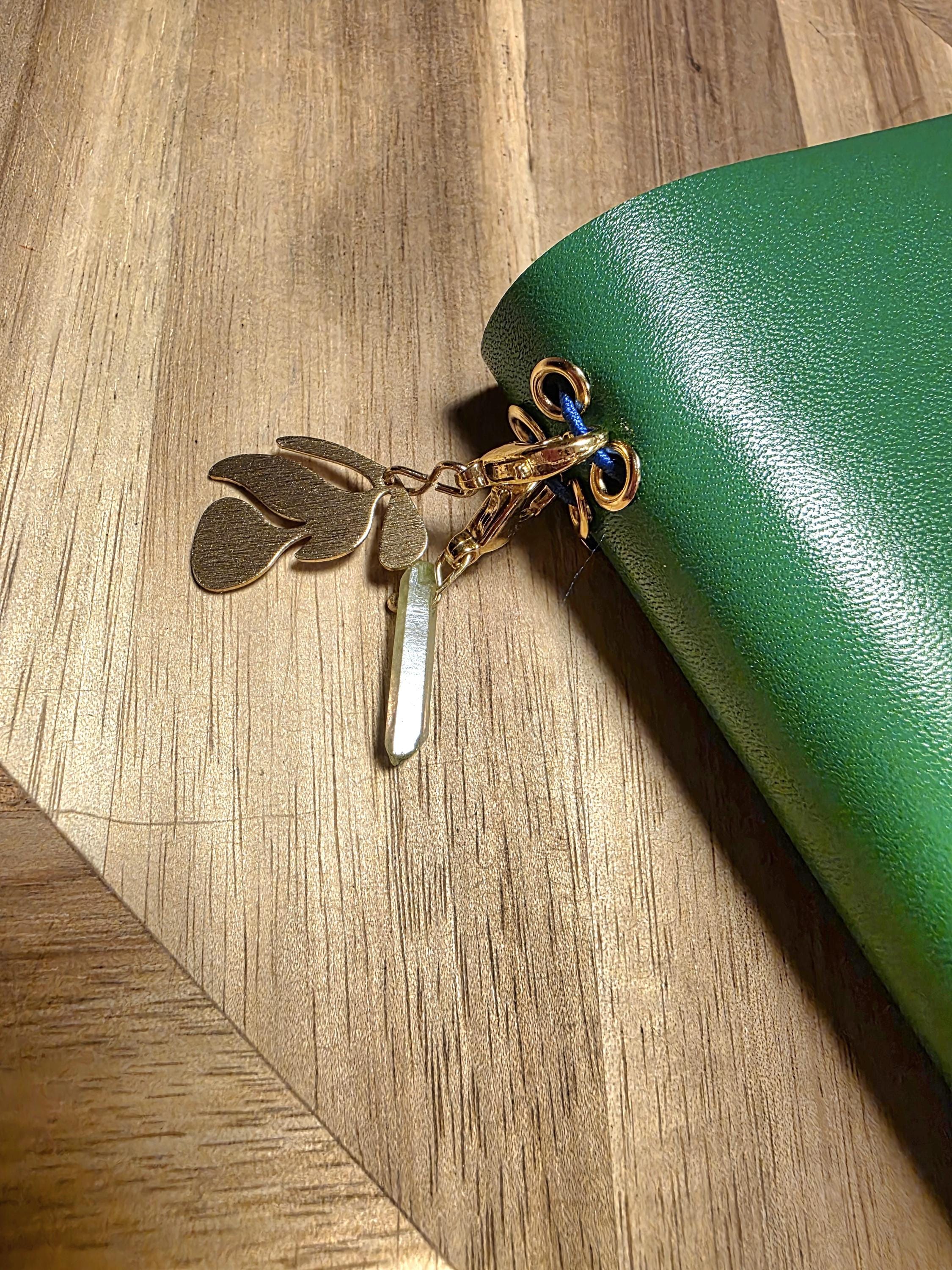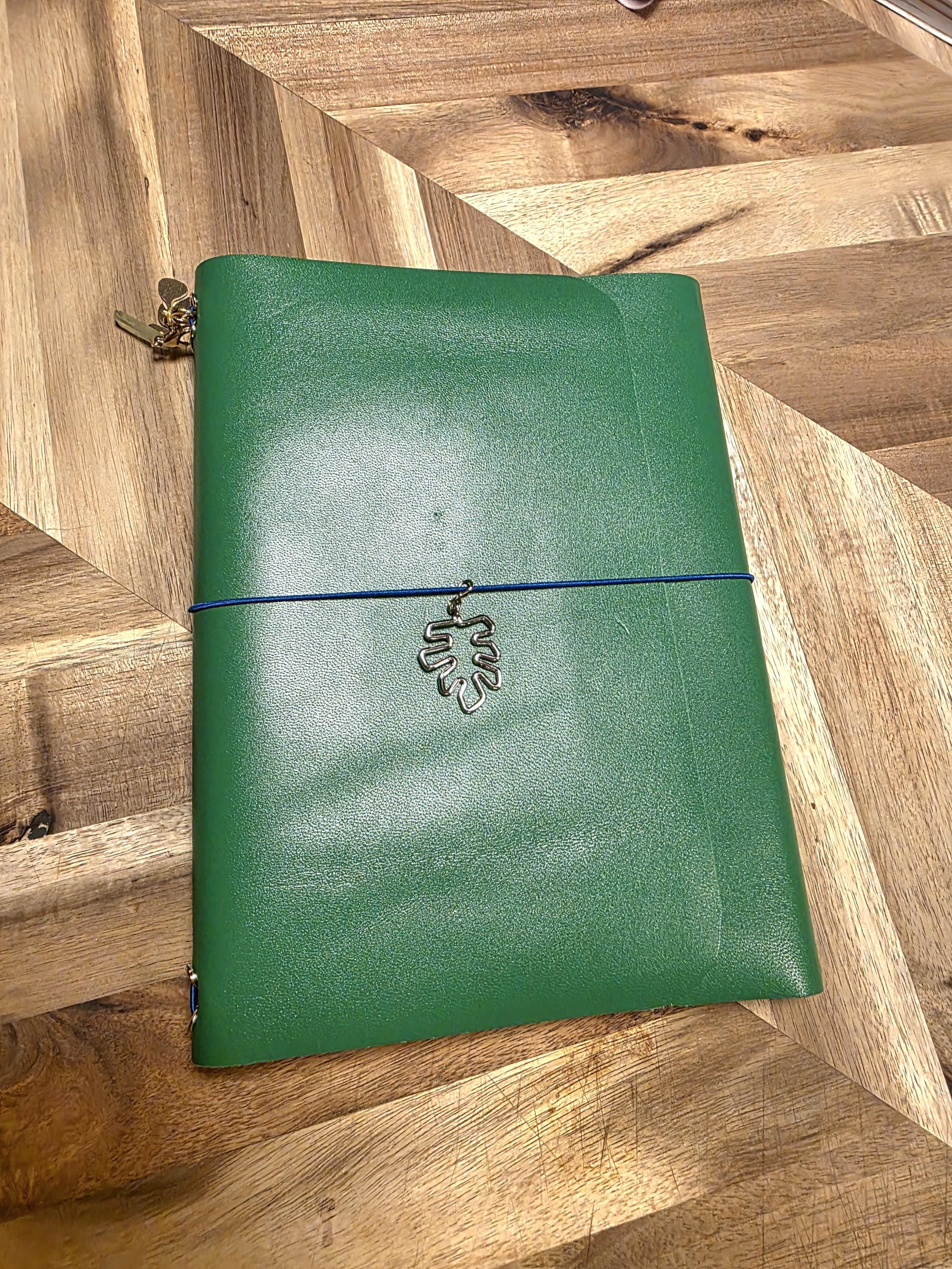 A beautiful bright green thin genuine leather with three floral notebook inserts. Perfect for a garden or plant lover. This journal comes with a rose gold monstera leaf large charm on the closure cord and a green quartz crystal and gold plant leaf removable spinal charms. Cording is navy blue.