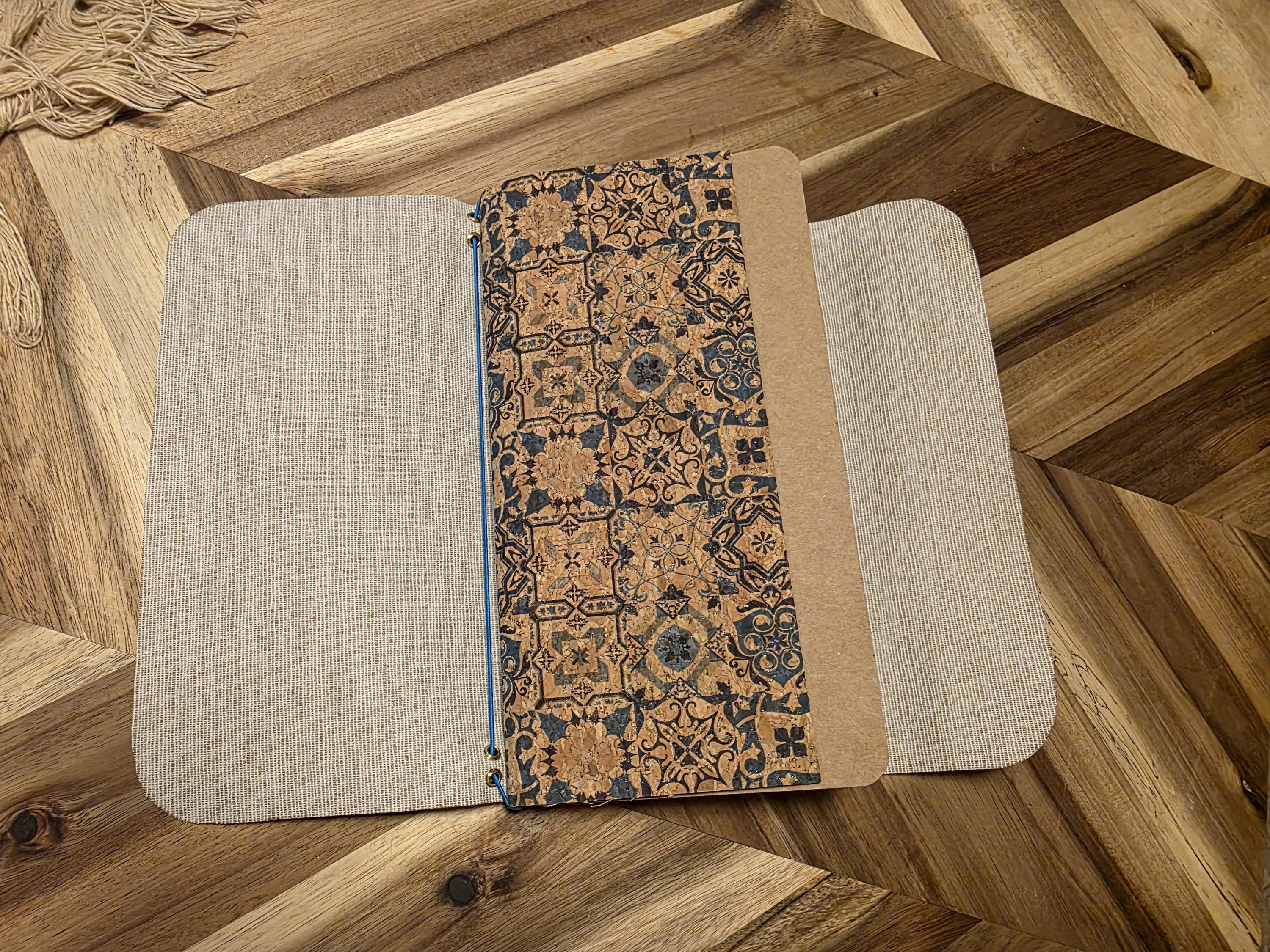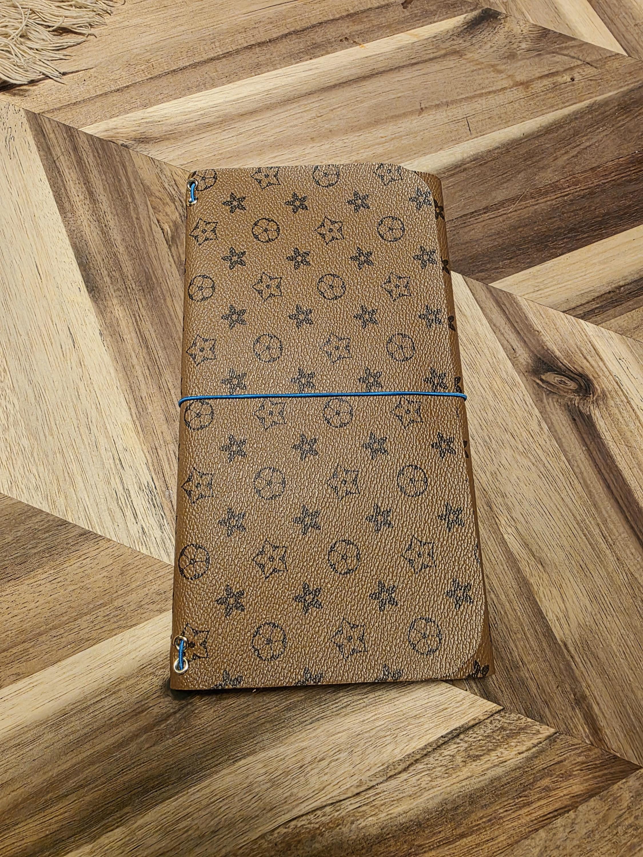 A helpful Travelers journal and pocket book fit for everyday use! A thin pu leather in a modern pattern design on a brown background. This journal has a 4 pocket Cork Wallet, 1 lined journal, 1 weekly planner.