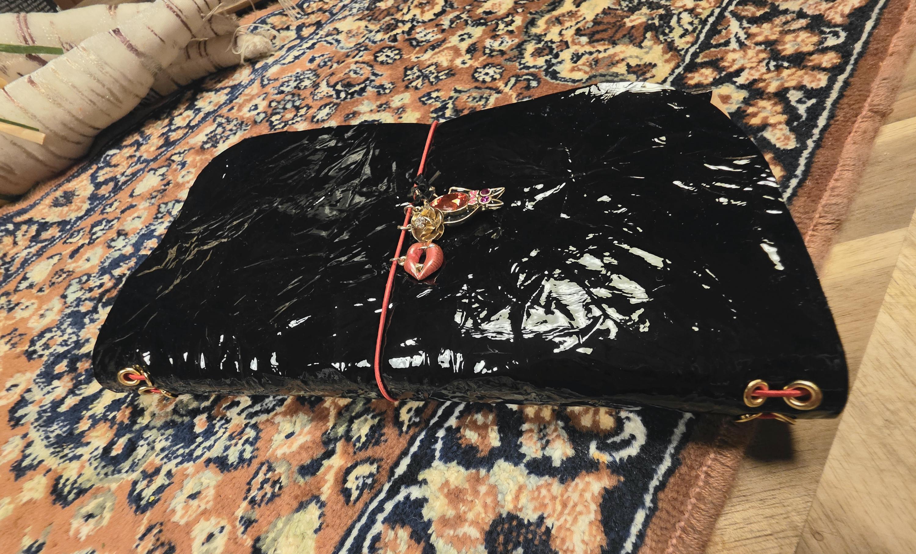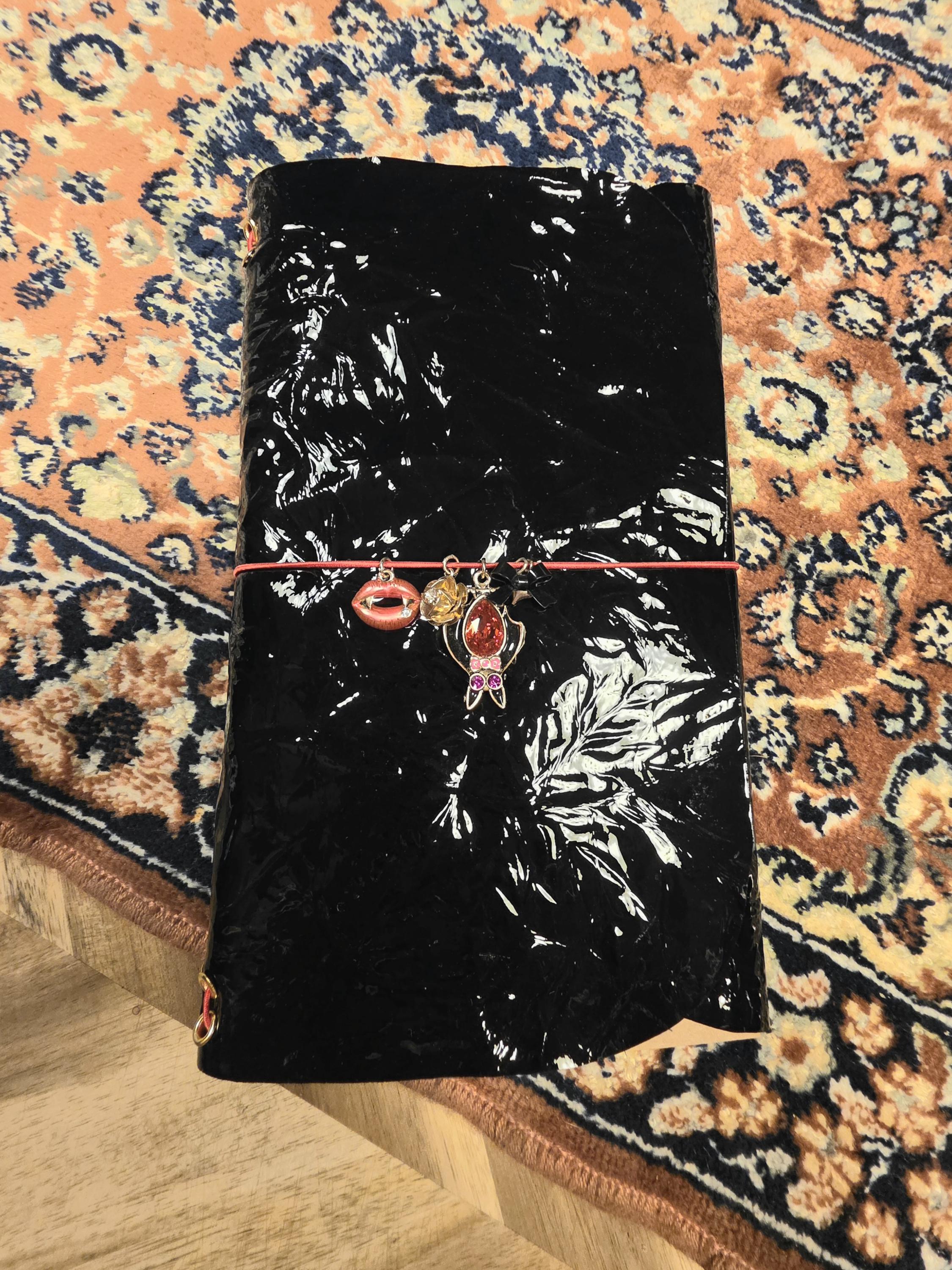 Meet Elizabeth! She is stunning black textured patent leather journal cover with 2 lined notebook inserts. She comes fitted with 5 vampire themed charms, red cording and gold grommets.
