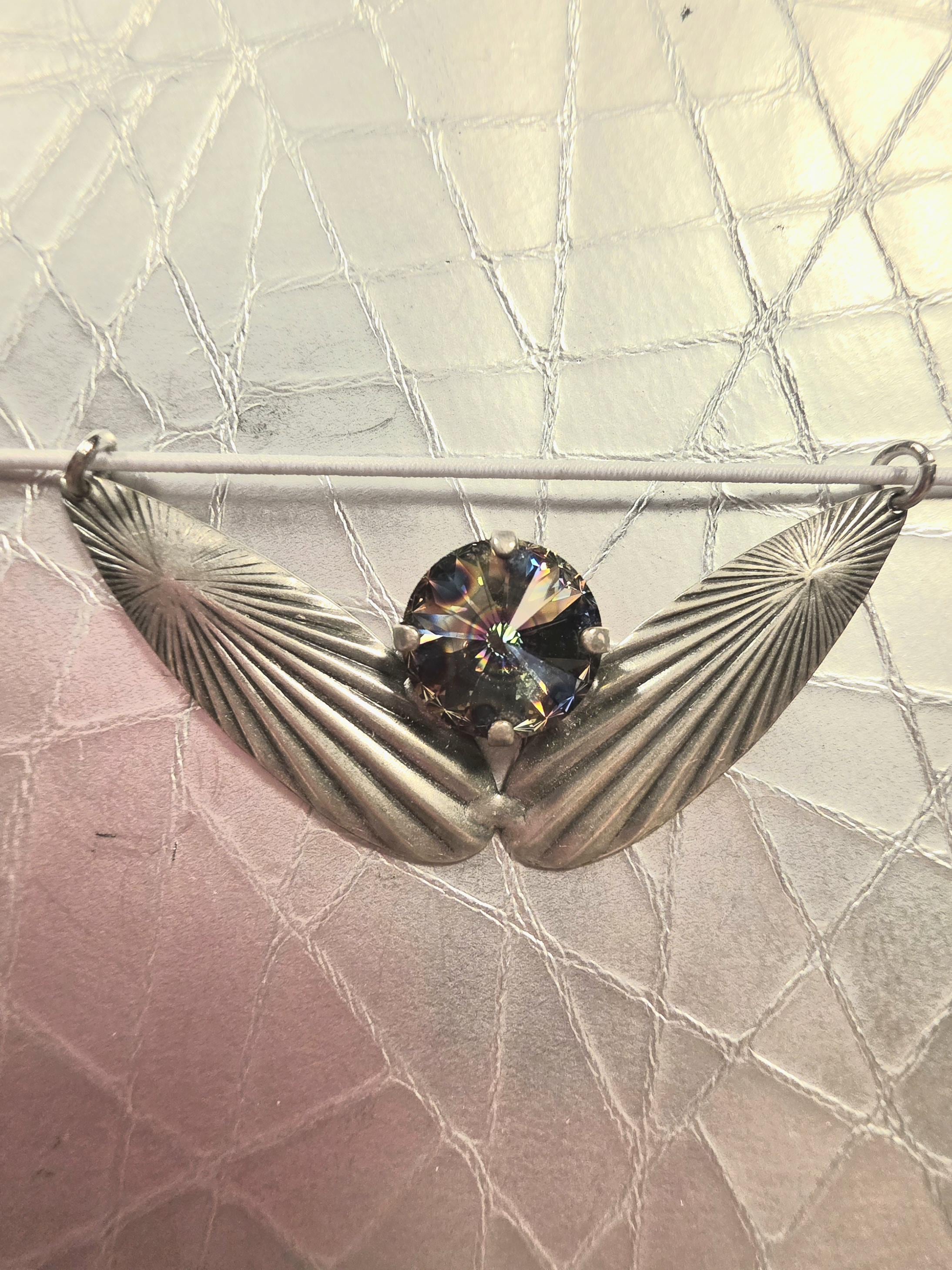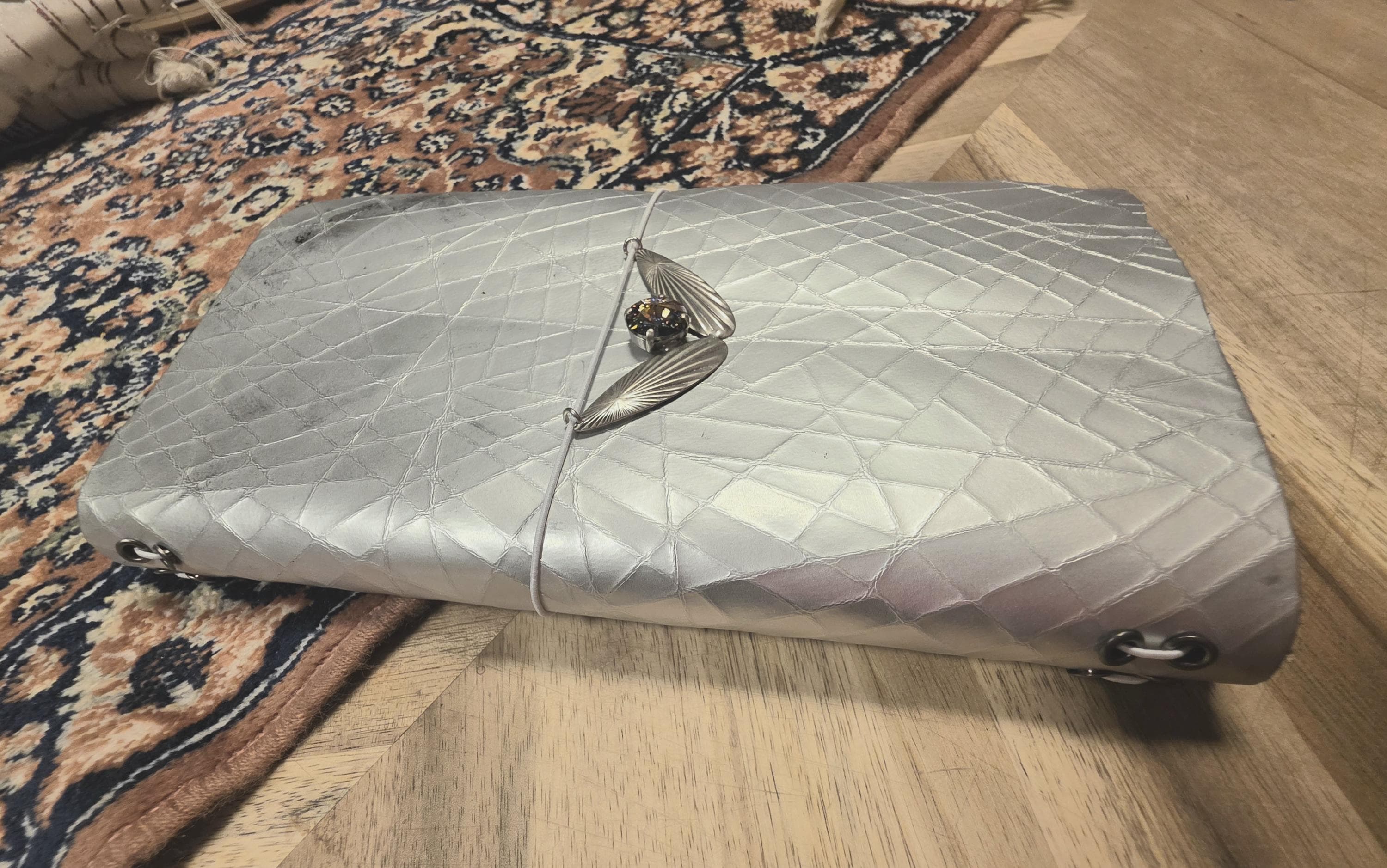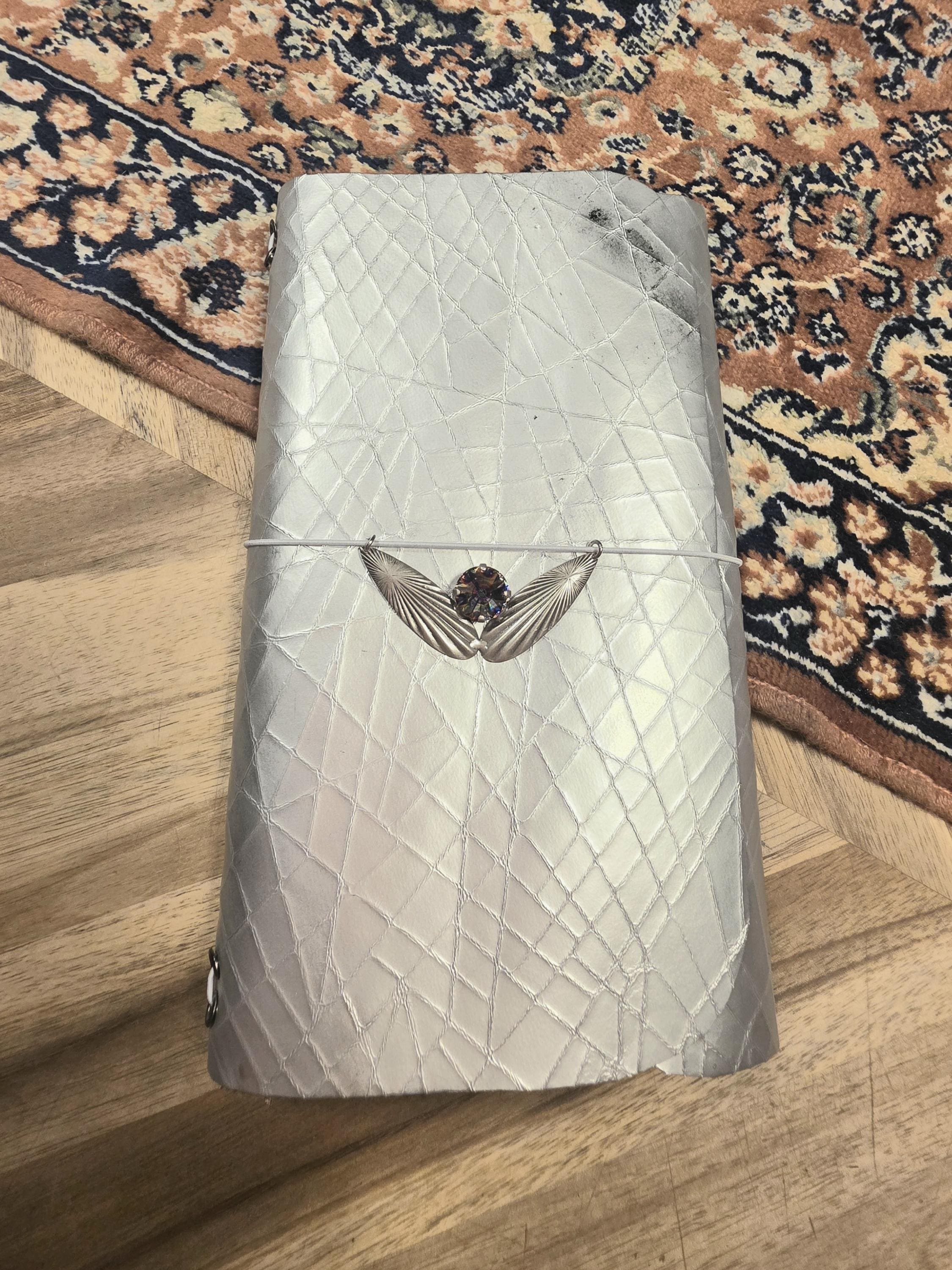 Meet Iris! She is a stunning silver textured leather journal cover with 2 lined notebook inserts. She comes fitted with a beautiful art deco pendant with a multi color swarovski crystal setting, icy lavender cording and nickel grommets.