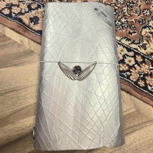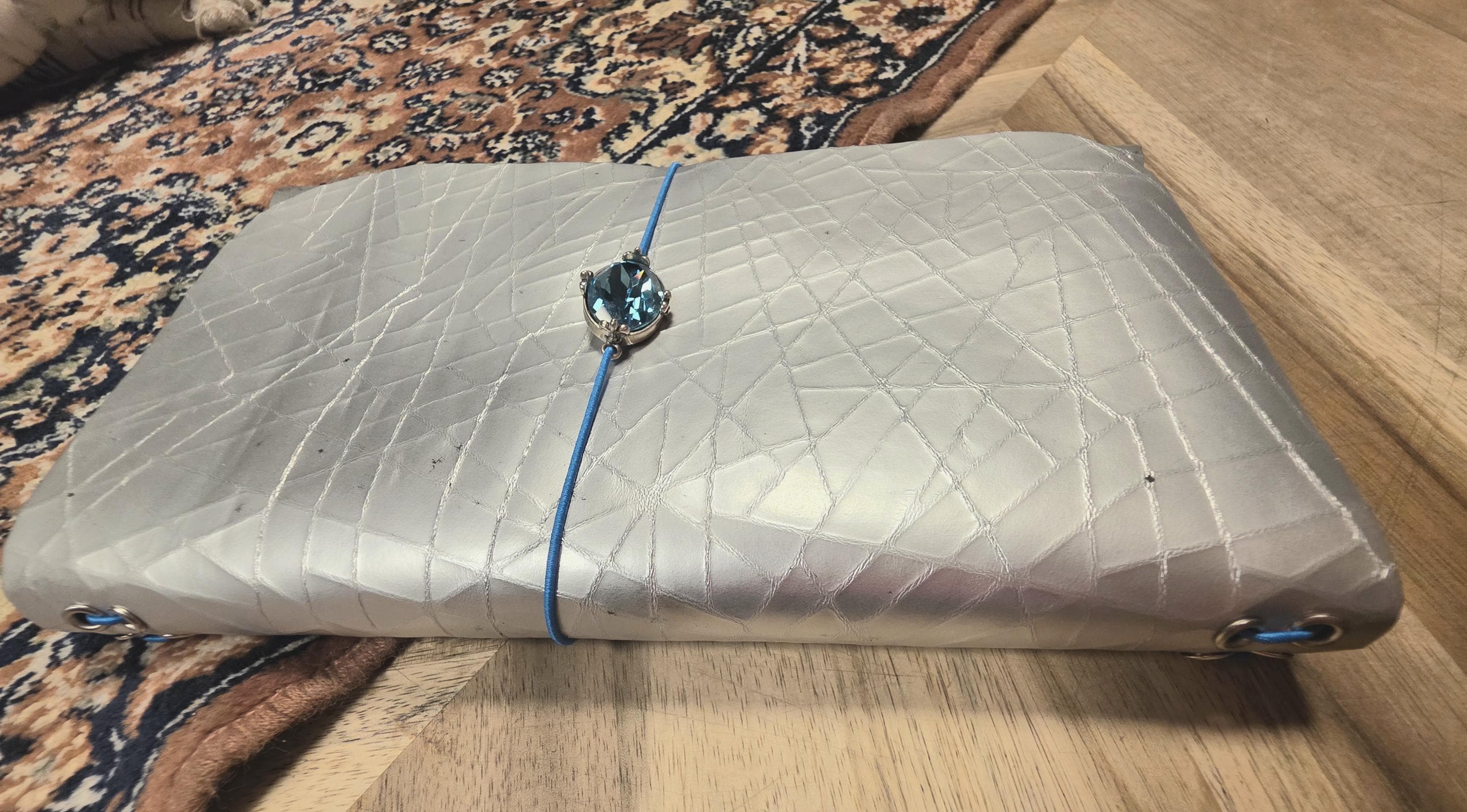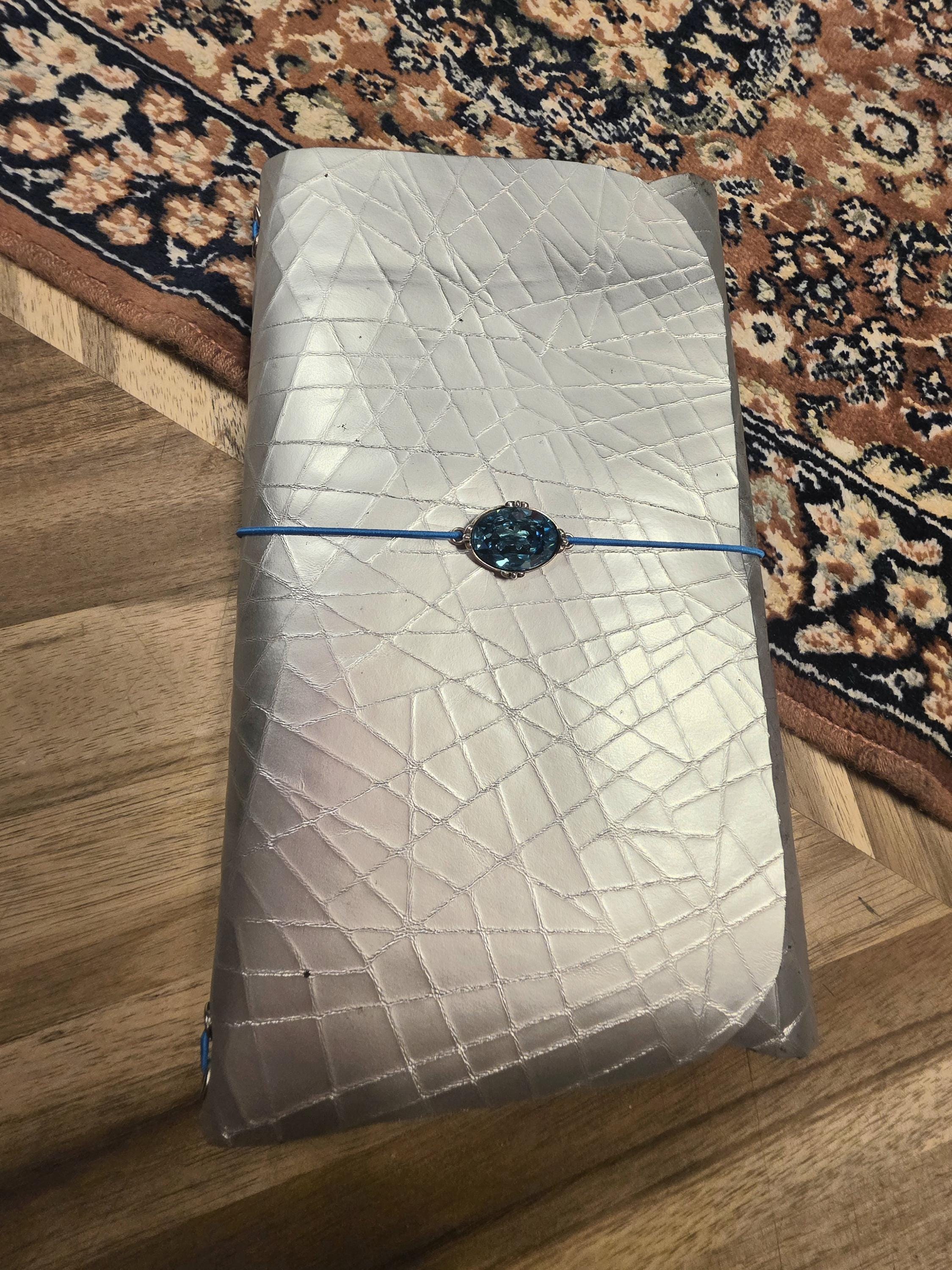 Meet Eleanor! She is a beautiful silver textured leather journal cover with 2 lined notebook inserts. She comes fitted with a large turquoise blue swarovski crystal silver connector, matching cording and silver grommets.