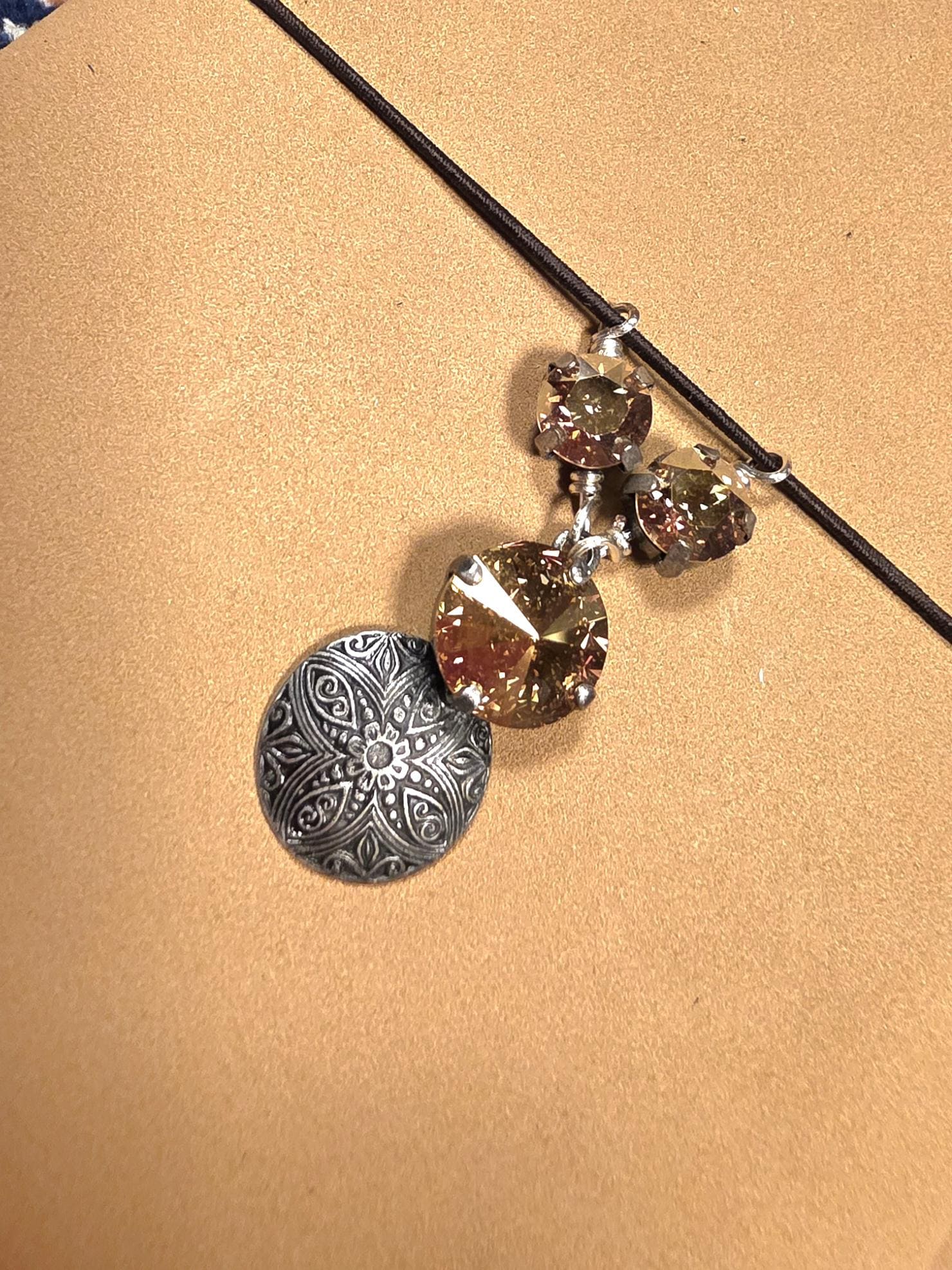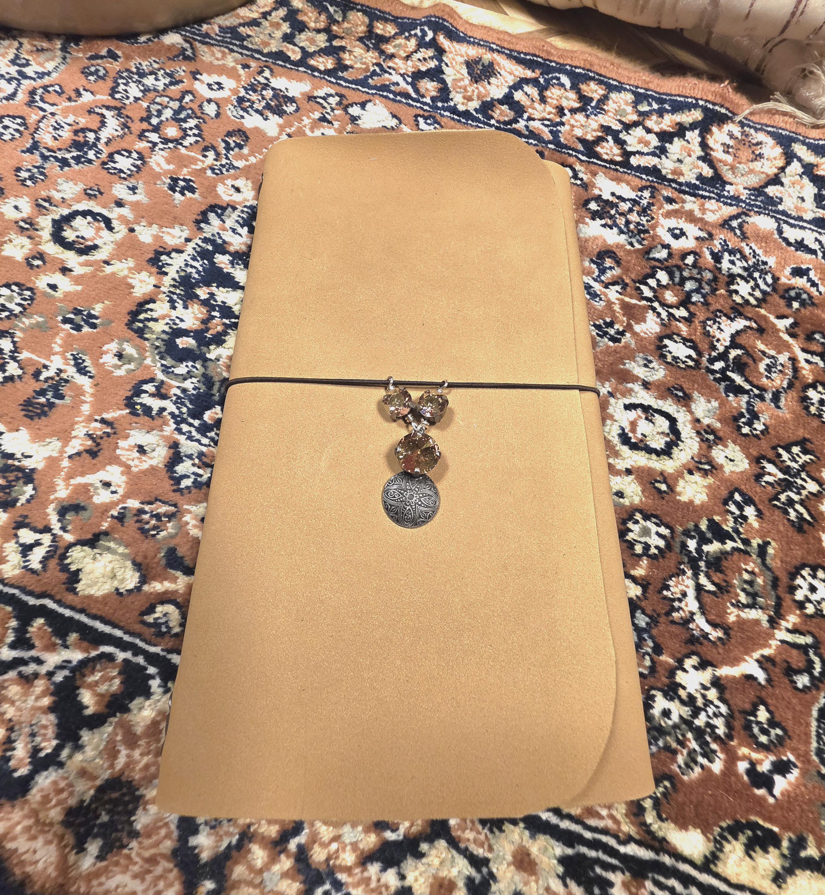 Meet Evelyn! She is a buttery antique gold leather journal cover with 2 lined notebook inserts. She comes fitted with a handcrafted antique silver celtic charm with 3 gold swarovski crystal settings, chocolate brown cording and antique silver grommets..